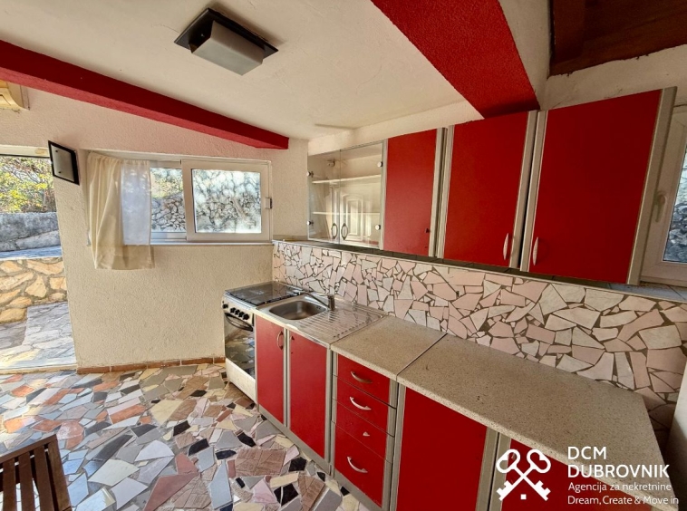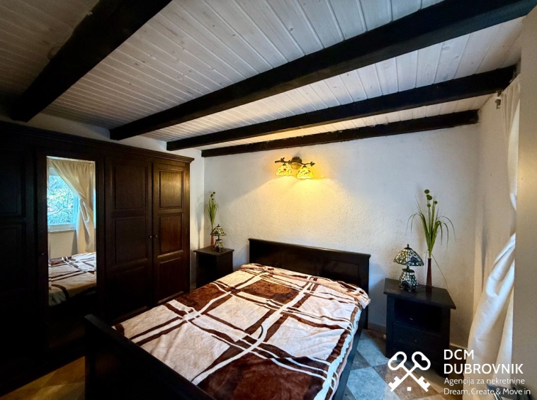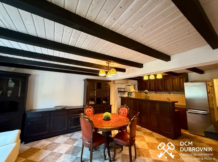 Gornja kuća od 67 m2 nudi prostrani dnevni boravak s kuhinjom i trpezarijom, jednu sobu, kupaonicu i dodatni prostor za walk-in ormar ili ured, opremljena u retro stilu i spremna za useljenje.